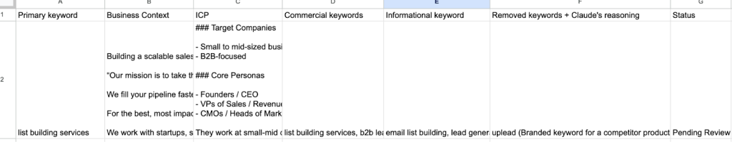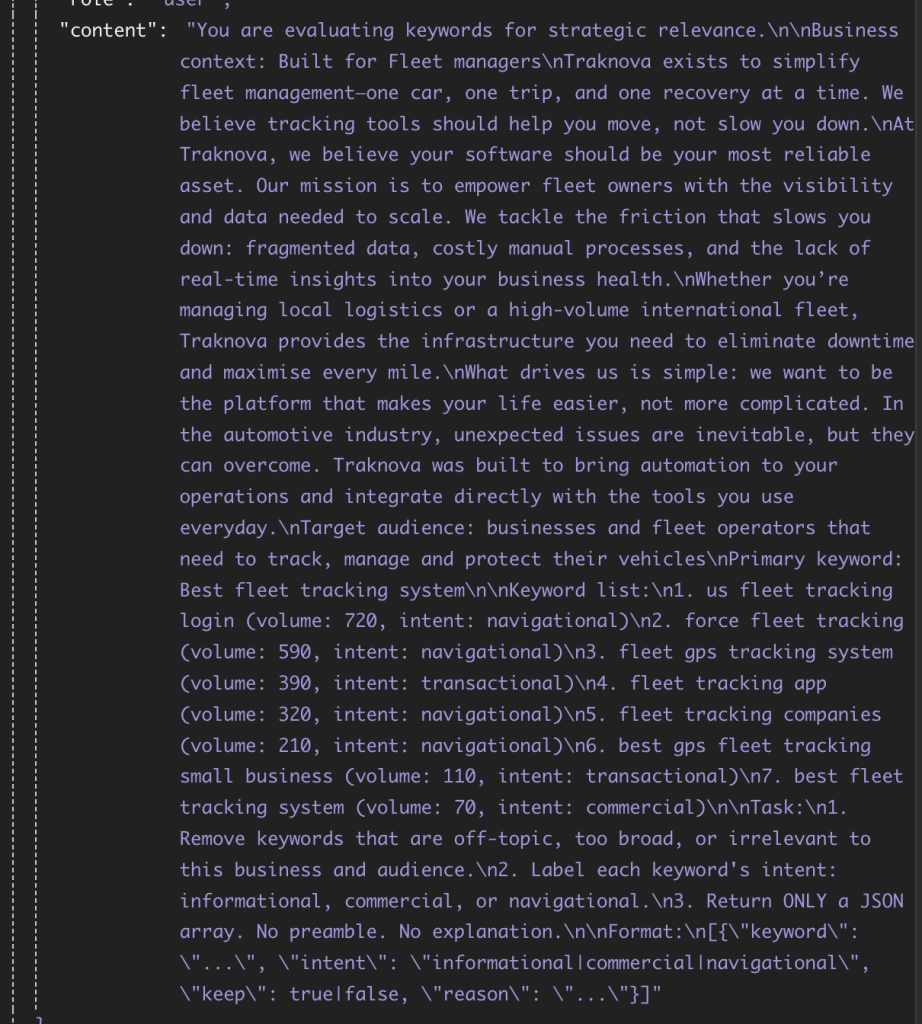 DataForSEO returns an array of keyword options. But not all of them are relevant to the business. I used Claude as a filter at this stage to extract only the keywords that are relevant to the business and ICP.