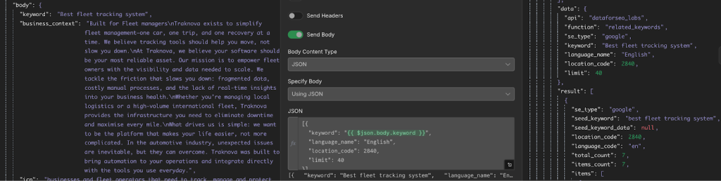 When you hit “Generate brief”, the form sends a POST request to a webhook which then passes the primary keyword to DataForSEO. DataForSEO returns all keywords related to the primary keyword.