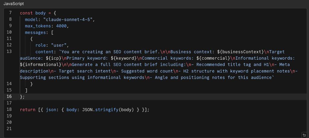 Once a change is made to the Status column, a JS node passes the primary keyword, business context, ICP, commercial keywords, and informational keywords to Claude to generate a full SEO brief.